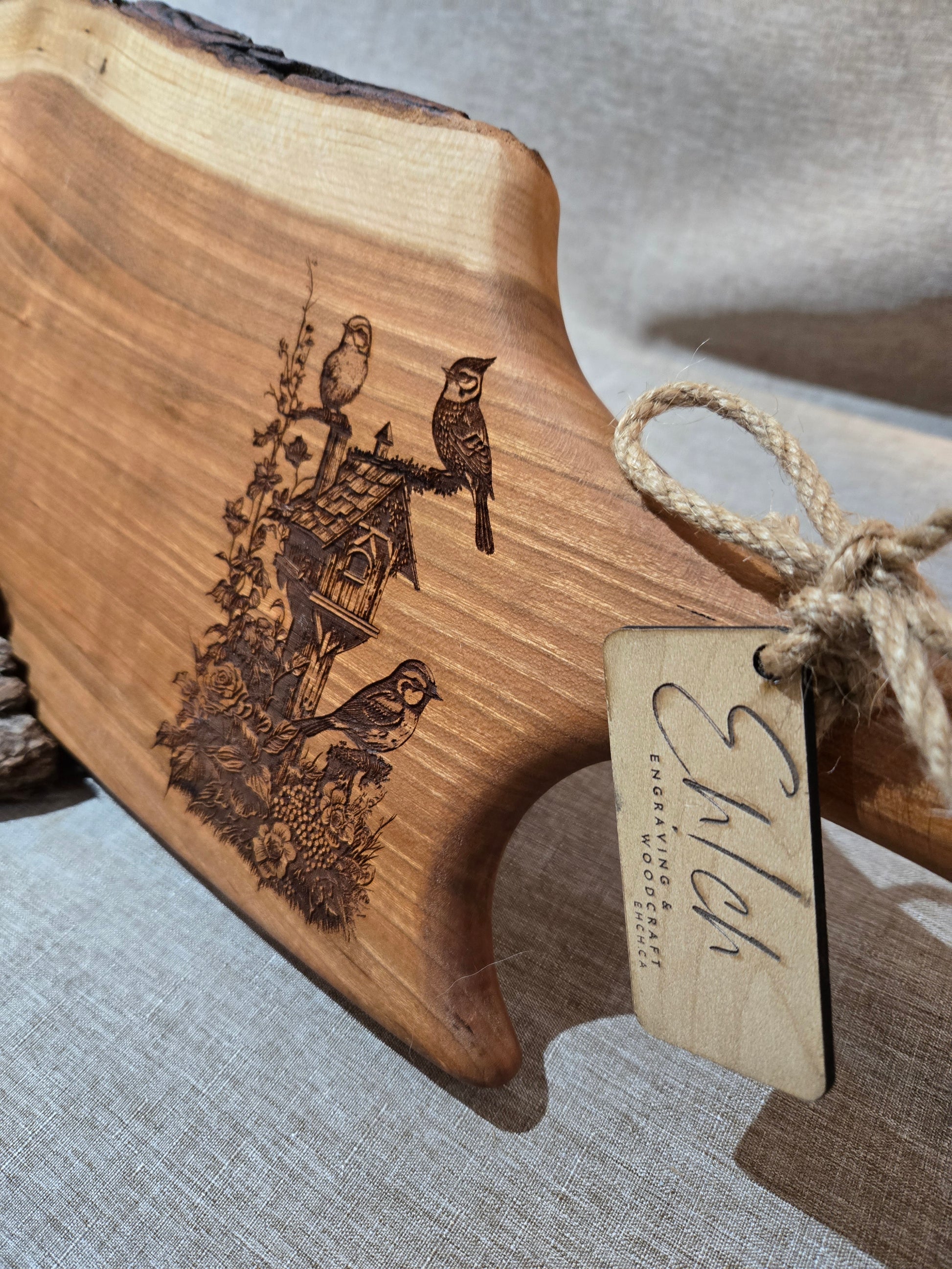 Beautiful Black Cherry Charcuterie Board with a deep cranberry red epoxy, birdhouse engraving and a fish tail handle.