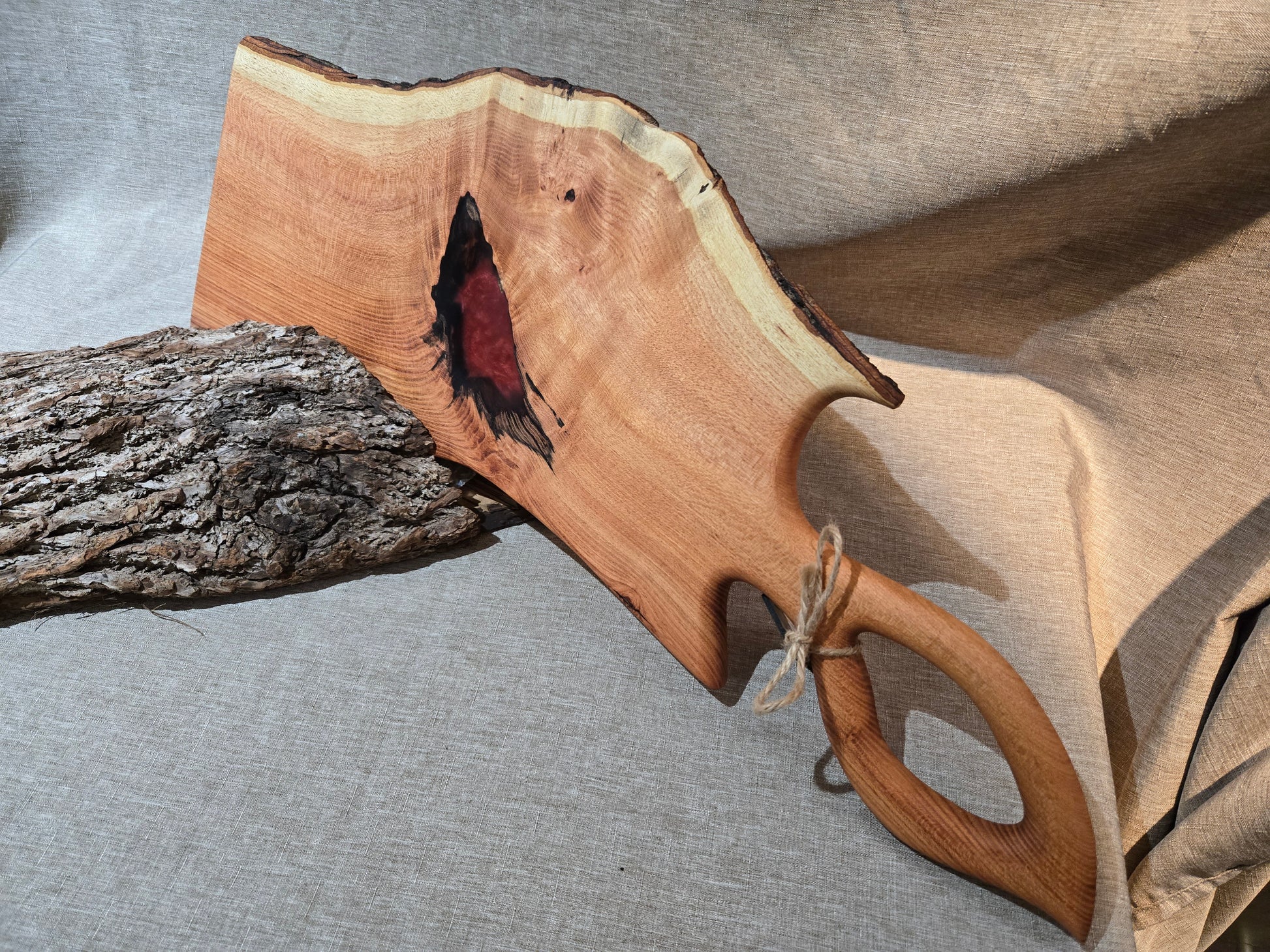 Honey Locust Charcuterie board, red epoxy accent and gothic style handle.