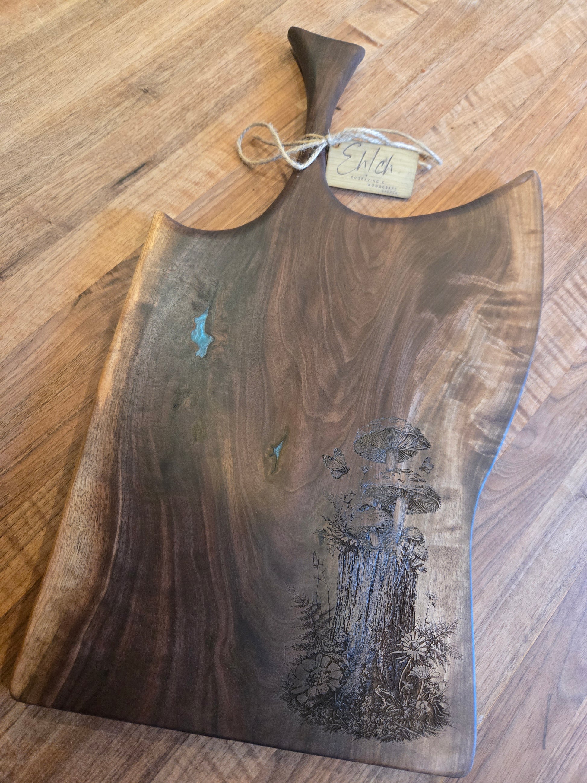Black Walnut Charcuterie board with teal green epoxy accent, mushroom scene and fish tail handle.