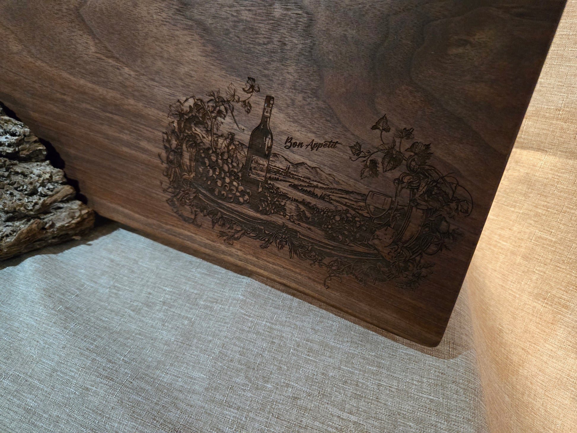 Walnut charcuterie board with a fish tail style handle and wine scene engraving.