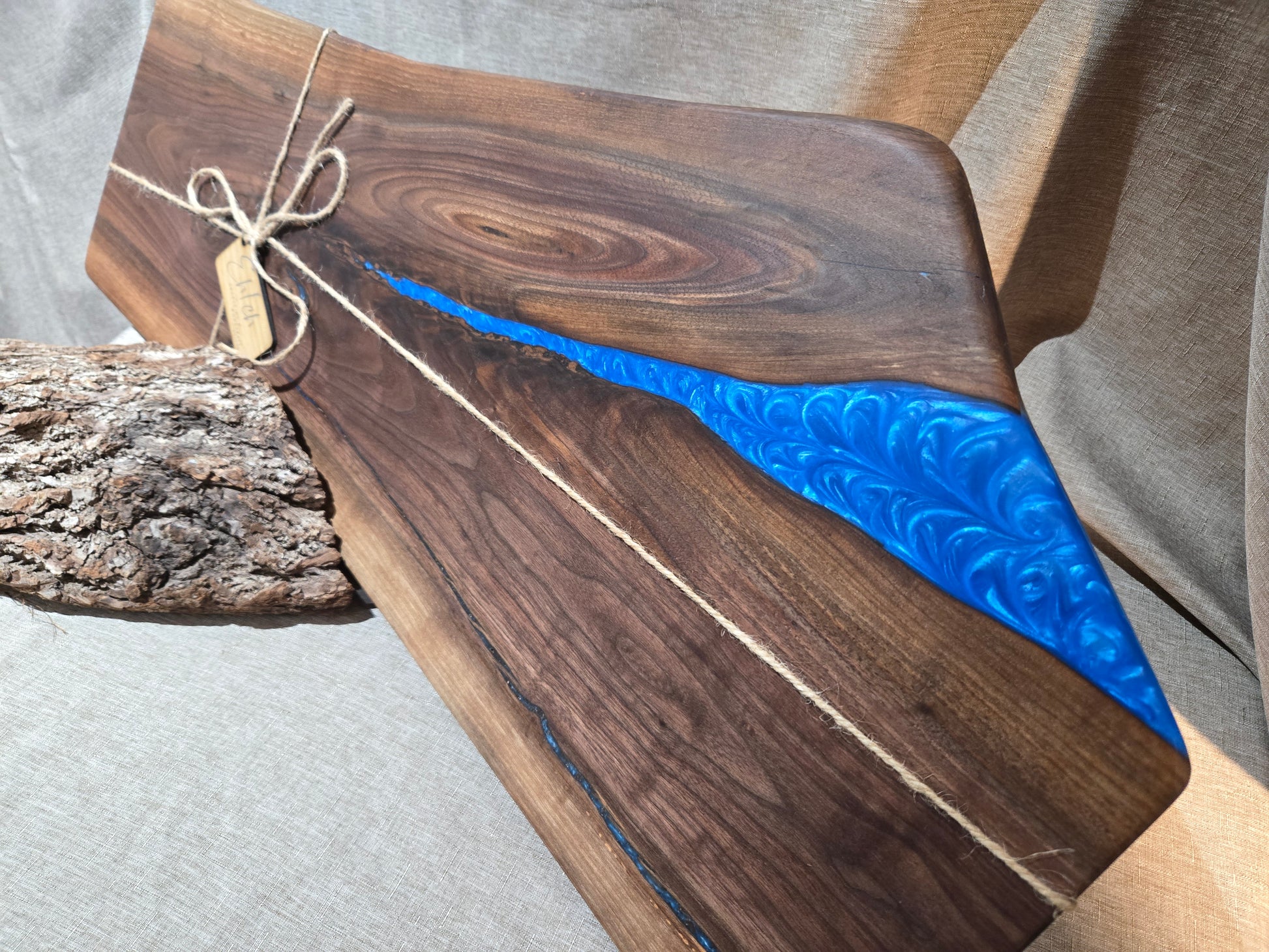 Black Walnut Charcuterie board with sky blue epoxy accent.